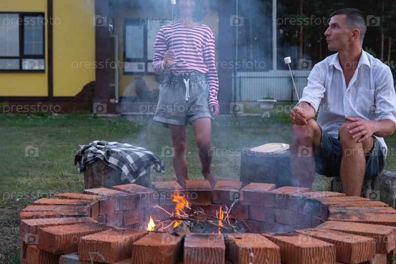 Семья мама, папа, дочь жарят зефир на шашлыках на костре в очаге во дворе дома у пожарной ямы уютным летним вечером