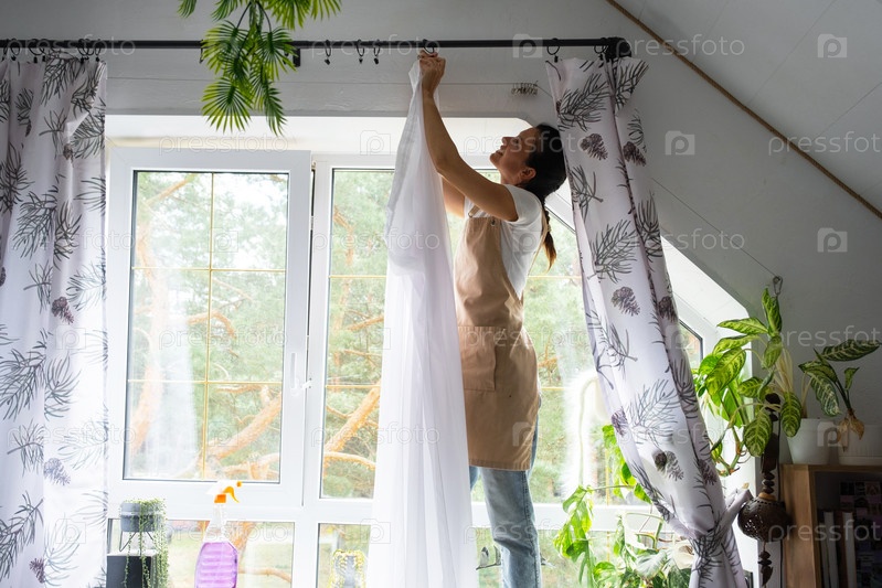 Женщина в фартуке вешает прозрачные тюльские шторы на большие чердачные окна в доме внутри интерьера с горшечными растениями. Весенняя уборка, уборка