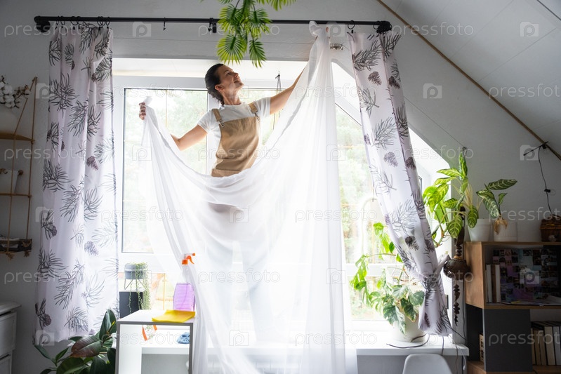 Женщина в фартуке вешает прозрачные тюльские шторы на большие чердачные окна в доме внутри интерьера с горшечными растениями. Весенняя уборка, уборка