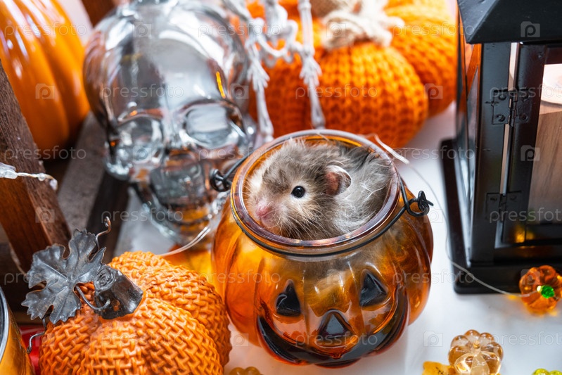 Забавный лохматый пушистый хомяк сидит внутри тыквы в вырезанном круглом отверстии и жует тыкву в декоре Хэллоуина среди гирлянд, фонарей, свечей. Фестиваль урожая