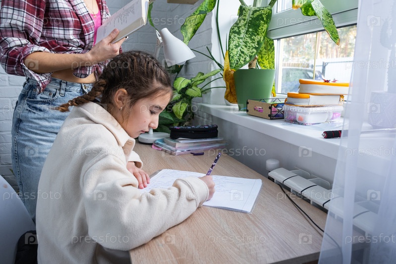 Мама помогает и проверяет домашнее задание школьницы для школы за столом