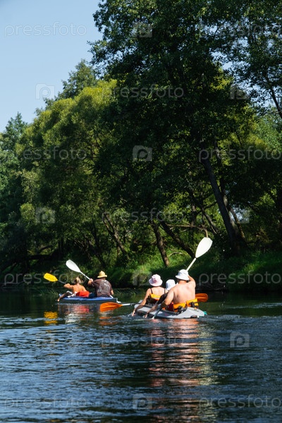 Семья с детьми на рафтинге в групповом каяк-путешествии разного возраста, взрослых, пожилых людей. Гребная лодка на реке, водный поход, летние приключения