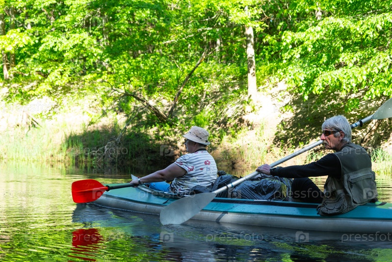 Семейная поездка на байдарках для сеньора и сеньоры. Пожилая супружеская пара гребля на лодке по реке, поход по воде, летнее приключение. Возрастные виды спорта, умственная молодость и здоровье, туризм, активная старость