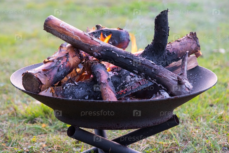 Металлическая огненная чаша с горящей древесиной во дворе. Безопасная декоративная пожарная яма