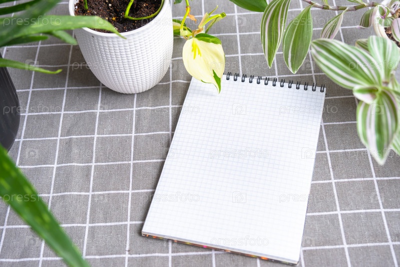 Пустой макет ноутбука с ручкой на столе с домашними горшечными растениями. Рекомендации по учету ухода за растениями