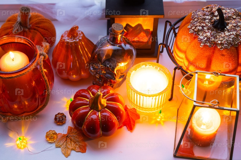 Праздничный декор дома на подоконнике к Хэллоуину - тыква, Джек о фонари, черепа, паутина, пауки, скелеты, свечи и гирлянда - уютное и страшное настроение