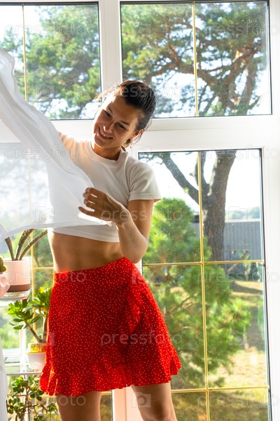Женщина вешает прозрачные тюльские шторы на большие окна в доме внутри интерьера с горшечными растениями. Весенняя уборка, уборка