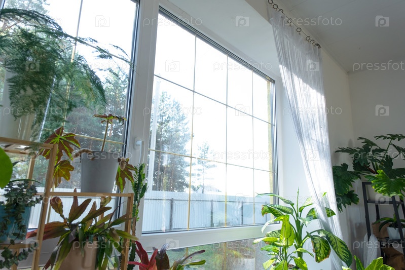 Окно изнутри дома пластиковое с двойным остеклением окна с видом снаружи на лес - внутренний салон с горшечными растениями, чистое стекло после чистки окон, закрытое окно