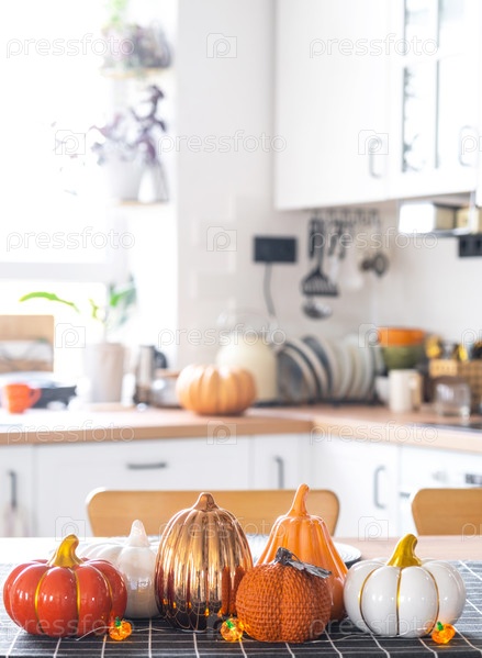 Декор белой классической кухни с тыквами, гирляндами, поздней для Хэллоуина и урожая с фигуркой дома. Осеннее настроение в домашнем интерьере, современный стиль лофта. недвижимость, страхование, ипотека