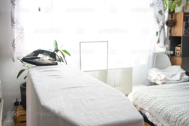 Железо находится на гладильной доске с простой тканью в комнате