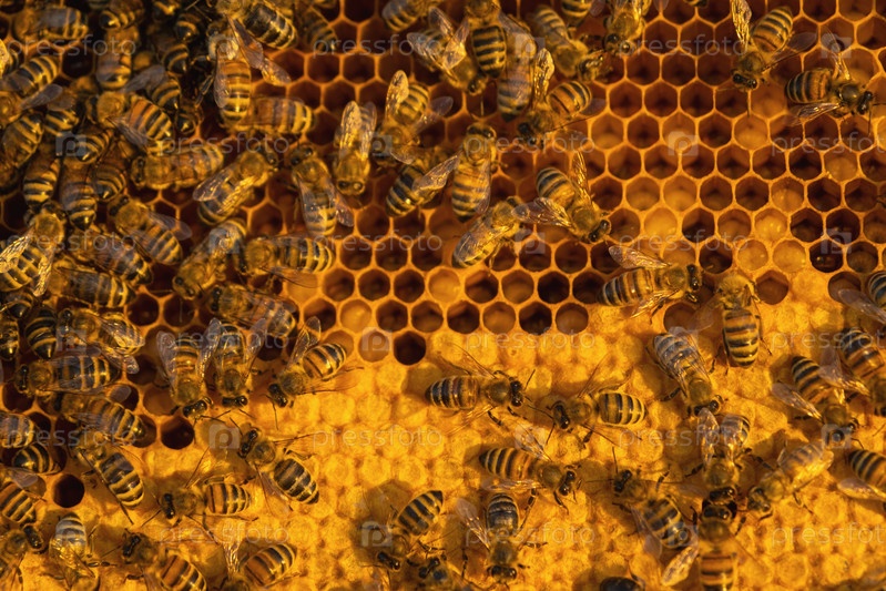 Пчелы сидят на сотах с медом в пчелиной раме крупным планом. Пчеловодство, уплотнение сот с воском и заливка меда, разведение и содержание пчел