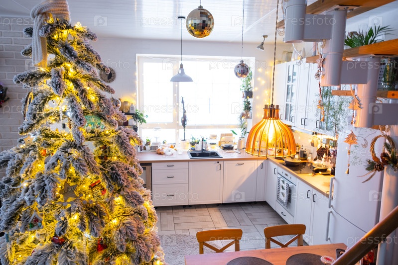 Рождественский декор в белой кухне, современный деревенский интерьер со снежной елкой и сказочными огнями. Новый год, рождественское настроение, уютный дом, Металлическая модульная лестница