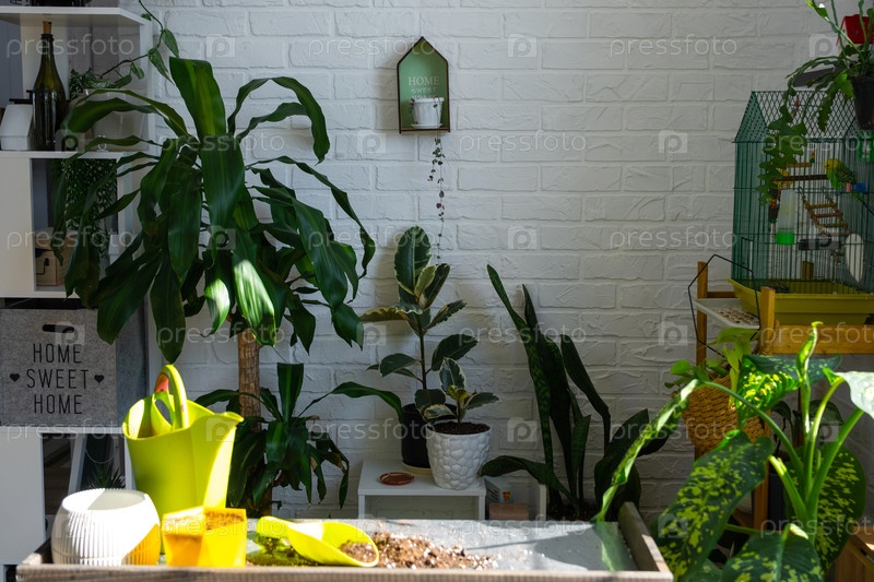 Таблица для пересадки домашних горшечных растений с почвой, совком, горшочками, полива может в интерьере зеленого дома. Хобби и бизнес по уходу и выращиванию тропических редких экзотических растений