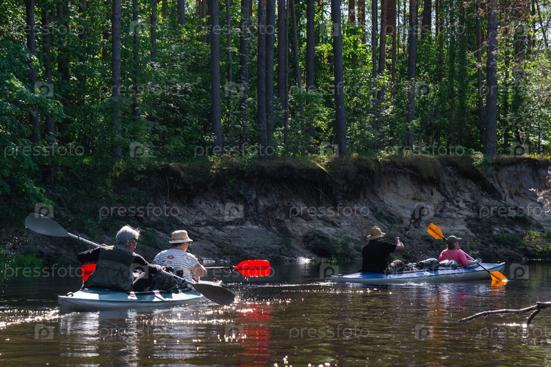 Групповая поездка на байдарках для сеньора и сеньоры. Пожилая пара и взрослая гребная лодка на реке, поход по воде, летнее приключение. Возрастные виды спорта, умственная молодость и здоровье, туризм, активная старость