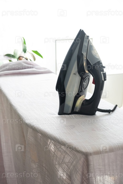 Железо находится на гладильной доске с простой тканью в комнате крупным планом