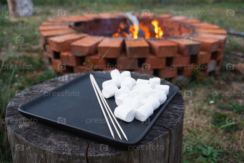 Маршмаллоу на подносе жарить на костре на круглом кирпичном костре во дворе дома