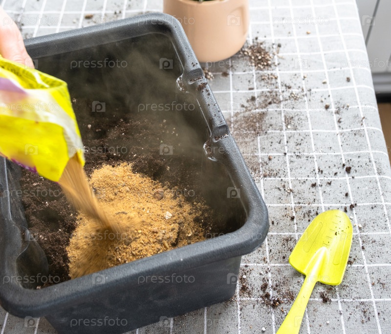 Ингредиенты для почвы домашних горшечных растений, торфа, земли, песка, перлита, вермикулита, кокоса. Смесь для посадки растений в перчатках цветочника смешивают в контейнере