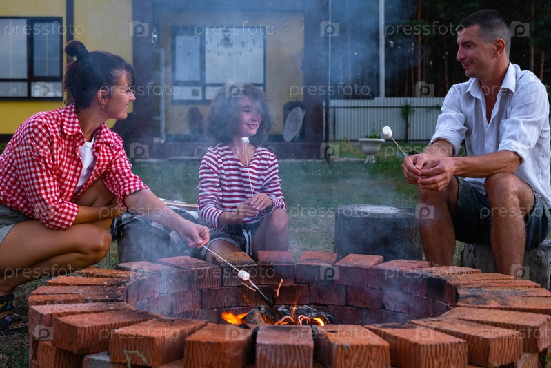 Семья мама, папа, дочь жарят зефир на шашлыках на костре в очаге во дворе дома у пожарной ямы уютным летним вечером
