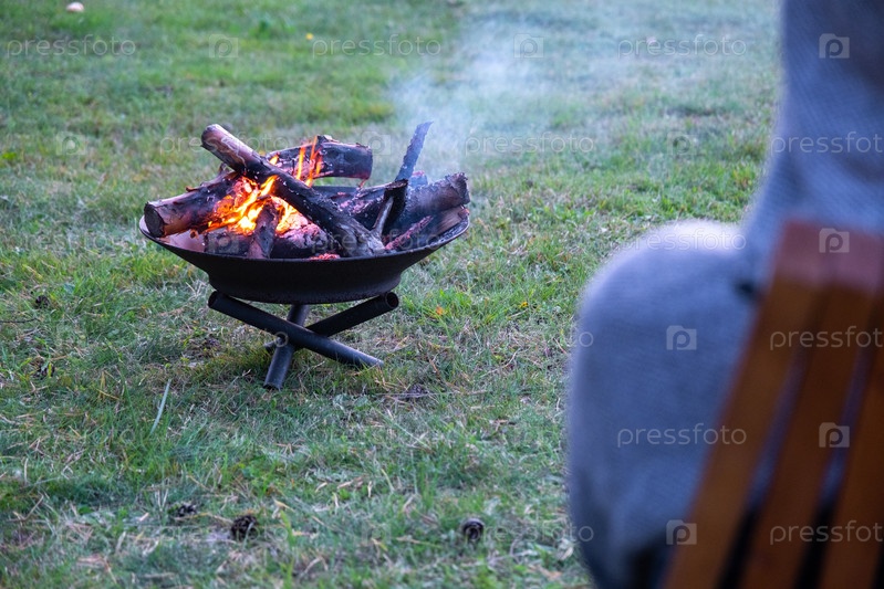 Металлическая огненная чаша с горящей древесиной во дворе. Безопасная декоративная пожарная яма
