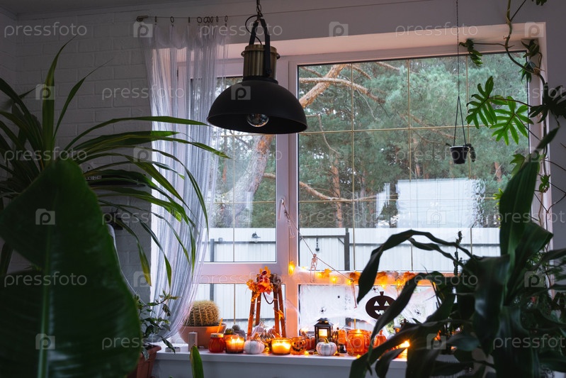 Праздничный декор дома на подоконнике к Хэллоуину в интерьере с домашними горшечными растениями- тыквами, Джеком о фонарях, черепами, скелетами, свечами и гирляндами - уютное и страшное настроение