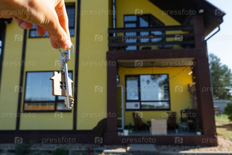Ключ к дому с крошечным домом в руках владельца рядом с коттеджем - продажа, переезд, бронирование, проект коттеджа, ипотека, страхование жилья и недвижимости