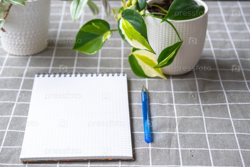 Пустой макет ноутбука с ручкой на столе с домашними горшечными растениями. Рекомендации по учету ухода за растениями