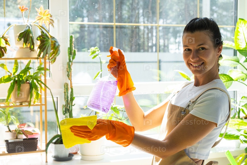 Женщина Портрет в резиновых перчатках и фартуке вручную моет окно дома тряпкой и шваброй внутри интерьера с домашними растениями. Восстановление порядка и чистоты весной, уборка сервиза