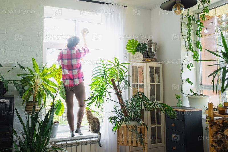 Женщина вручную моет окно дома тряпкой и шваброй внутри интерьера с белыми шторами и домашними растениями. Восстановление порядка и чистоты весной, уборка сервиза