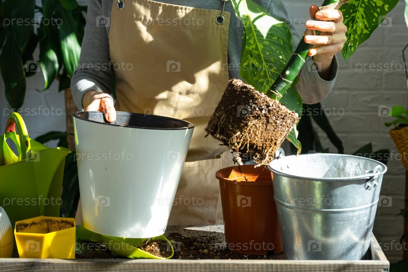 Пересадка и уход за домашним растением dieffenbachia Cheetah в новый горшок в домашнем интерьере. Женщина разводит и выращивает растения как хобби, держит вариетальную диффенбахию с большими пятнистыми листьями, больших размеров