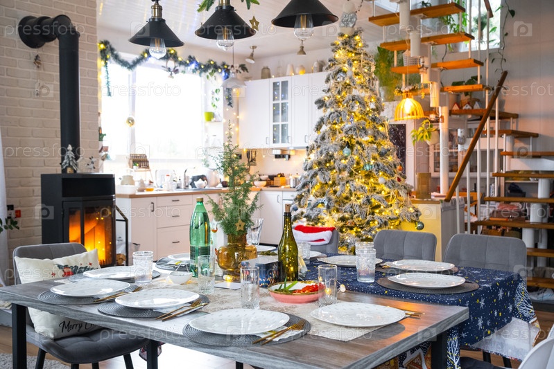 Праздничный интерьер дома оформлен на Рождество и Новый год в стиле лофт с черной плитой, камином, рождественской елкой. Теплый студийный номер с установленным столом, горящее дерево, уют и отопление дома