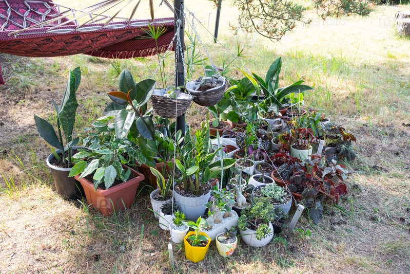 Домашние тропические растения — это группа, выходящая на улицу летом, чтобы ускорить рост. Ходячие домашние растения в горшках в саду