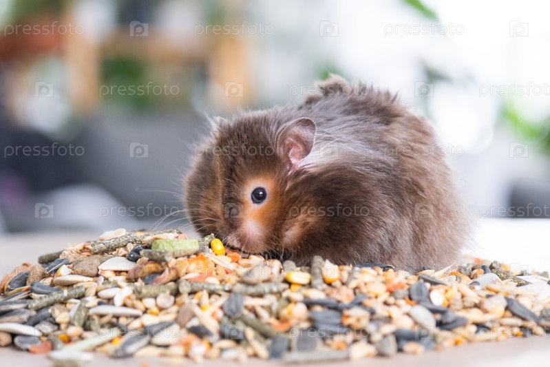 Забавный пушистый сирийский хомяк сидит на горстке семян и ест и набивает щеки припасами. Питание для грызунов, витамины. Закрытие