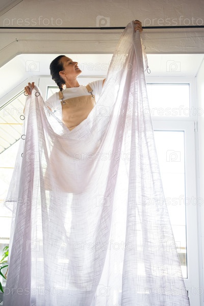 Женщина в фартуке вешает прозрачные тюльские шторы на большие чердачные окна в доме внутри белого интерьера. Весенняя уборка, уборка