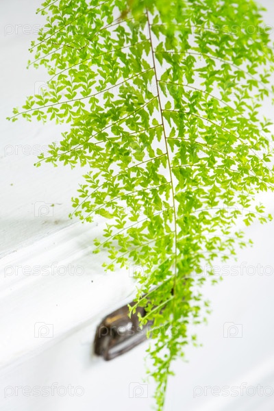 Закрытие Пышный папоротник в белом интерьере в стиле лофт. Нефролепис Мариса - разнообразный декоративный папоротник