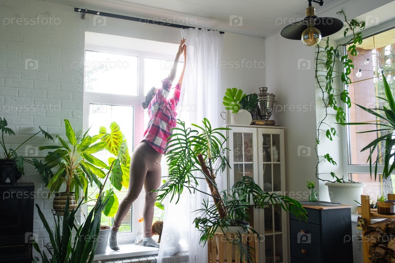 Женщина вешает прозрачные тюльские шторы на большие окна в доме внутри интерьера. Весенняя уборка, уборка