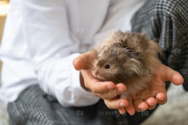 Забавный пушистый любопытный сирийский хомяк, сидящий на руках у ребенка. Домашний прирученный питомец, ручной, Закрытие, копирование пространства