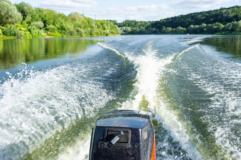 Волны на реке летом от мотора лодки сзади. Водные путешествия, речной лодочный тур, внутренний туризм