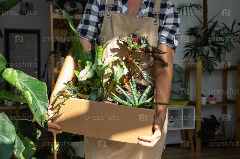 Флорист упаковывает комнатные растения в коробку для доставки покупателю. Продажа, безопасная отправка растений из магазина, посылка. Цветочный магазин, домашний бизнес