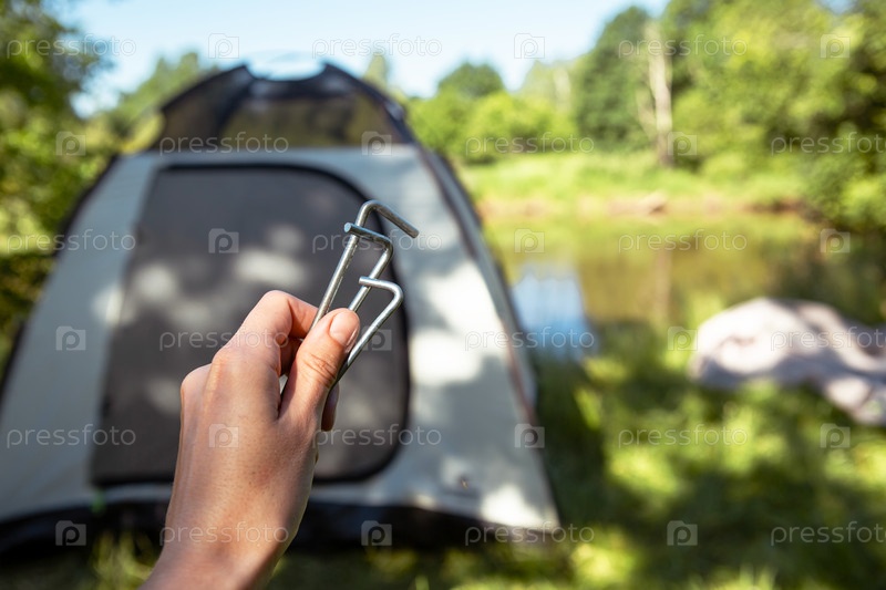 Алюминиевые колья для установки туристической палатки в руке крупным планом. Легкое оборудование для туризма. Наружная деятельность, инструкции по сборке, внутренний экотуризм. Копировать пространство