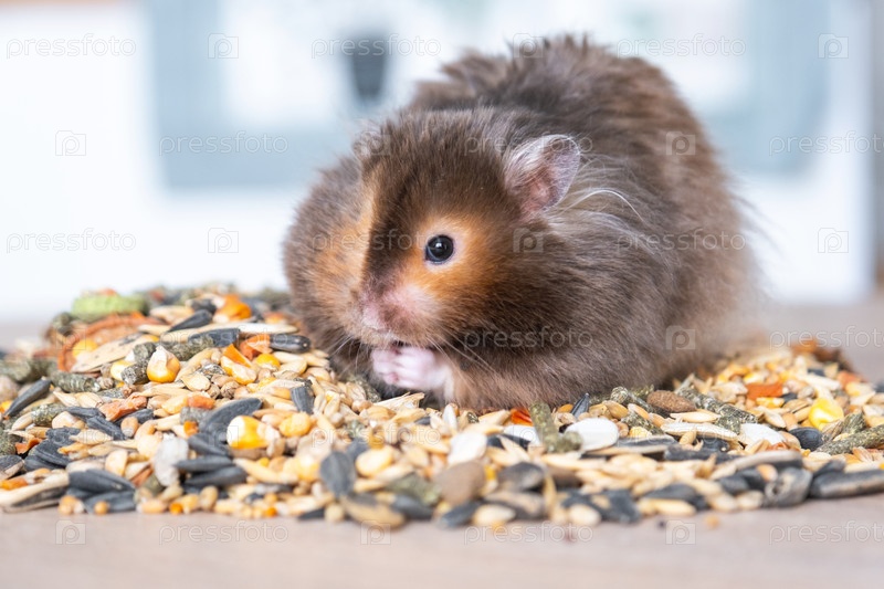 Забавный пушистый сирийский хомяк сидит на горстке семян и ест и набивает щеки припасами. Питание для грызунов, витамины. Закрытие