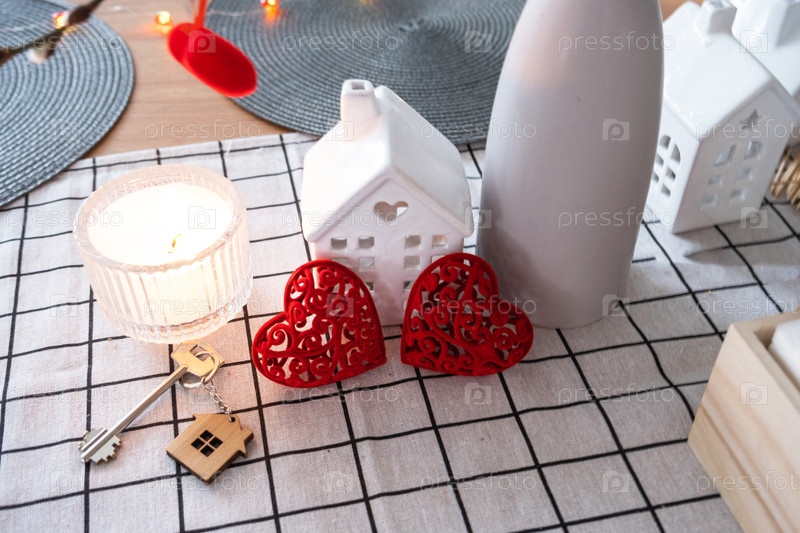 Ключ к крошечному дому уютного дома с декором Валентина на столе кухни. Подарок на день валентинок, семейное гнездо любви. дизайн, проект, переезд в новый дом, ипотека, аренда и покупка недвижимости