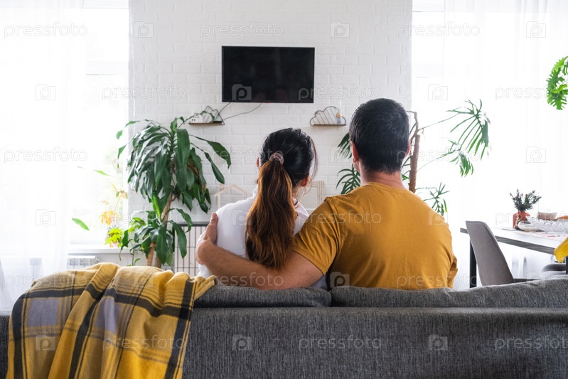 Мужчина и женщина дома в белом интерьере сидит на диване и смотрит телевизор, черный экран высмеивает. Домашний отдых, досуг, любовь, семья, дата