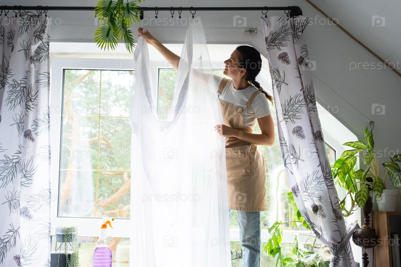 Женщина в фартуке вешает прозрачные тюльские шторы на большие чердачные окна в доме внутри интерьера с горшечными растениями. Весенняя уборка, уборка
