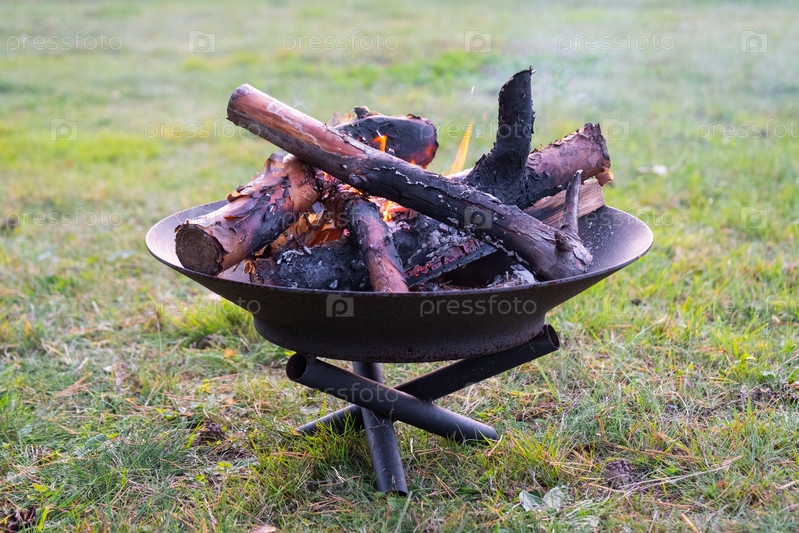 Металлическая огненная чаша с горящей древесиной во дворе. Безопасная декоративная пожарная яма
