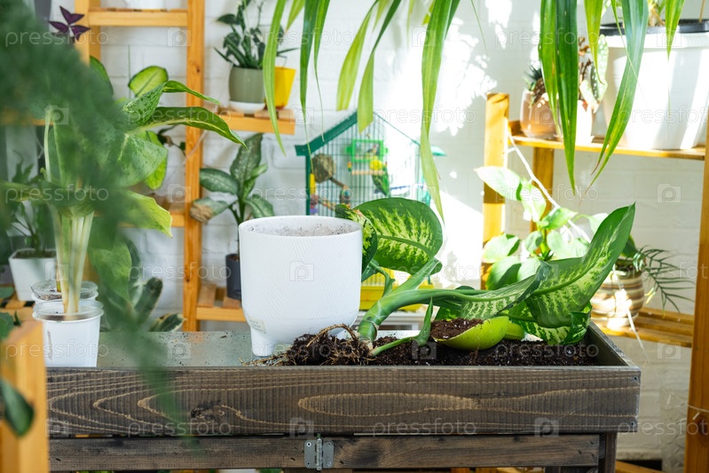 Тропический снег на столе для пересадки и ухода за домашними растениями в интерьере зеленого дома с горшечными растениями