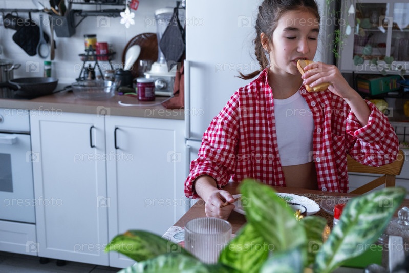 Девушка завтракает на кухне с яичницей и бутербродом за столом по утрам