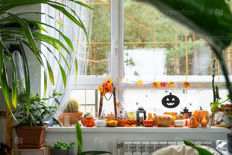 Праздничный декор дома на подоконнике к Хэллоуину в интерьере с домашними горшечными растениями- тыквами, Джеком о фонарях, черепами, скелетами, свечами и гирляндами - уютное и страшное настроение