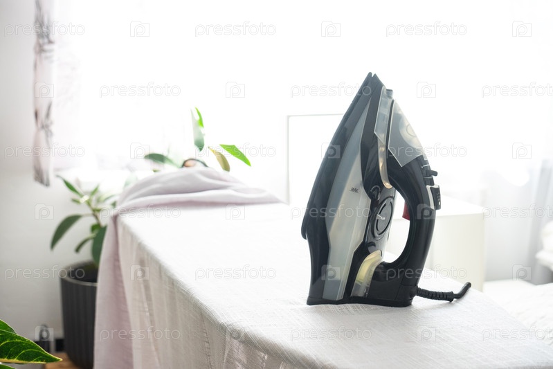Железо находится на гладильной доске с простой тканью в комнате крупным планом