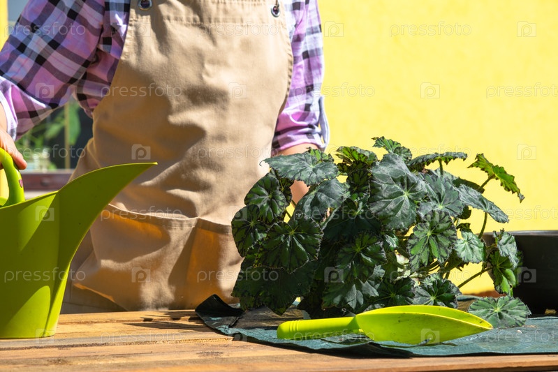 Женщина-флористка в фартуке пересаживает наружный завод begonia для озеленения в наружных плантаторах