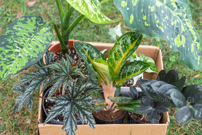 Упакуйте комнатные растения в коробку для доставки покупателю. Продажа, безопасная отправка растений из магазина, посылка. Цветочный магазин, домашний малый бизнес, питомник